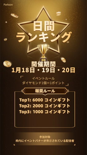 イベントルールダイヤモンド1個=1ポイントTop1: 6000 コインギフトTop2: 2000 コインギフトTop3: 1000 コインギフト
